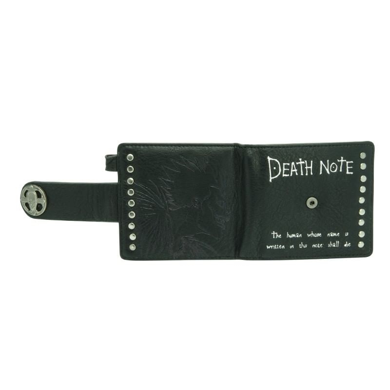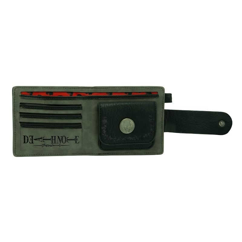 Jedinečná peněženka pro všechny fanoušky japonské mangy Zápisník smrti - Death Note má kovové zdobení a zapínání v podobě symbolu boha smrti Ryuka. Peněženka nabízí své služby vašim platebním kartám, dokladům, vstupenkám či jízdenkám, nechybí zavírácí kapsa na drobné mince. Součástí je řetěz s karabinou dlouhý 74 cm.