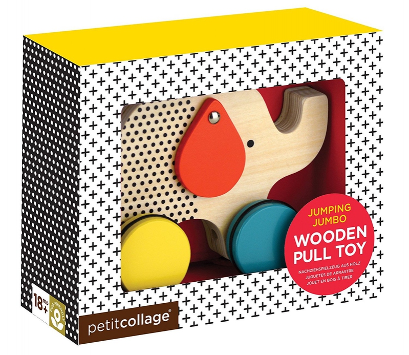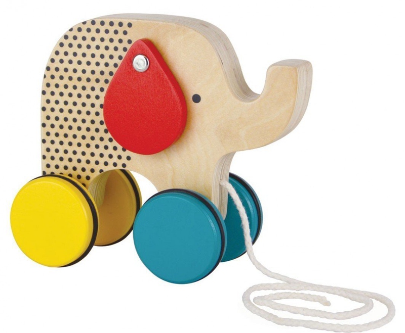 Petitcollage dřevěný tahací slon Jumbo. Tahací barevný slon na provázku. Kola jsou opatřeny gumovým proužkem pro tichý chod na pevné podlaze.