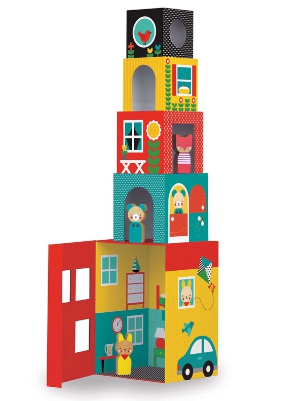 Věž z recyklovaného kartonu s dřevěnými postavičkami. Postav věž, která je zároveň domečkem pro dřevěná zvířátka.