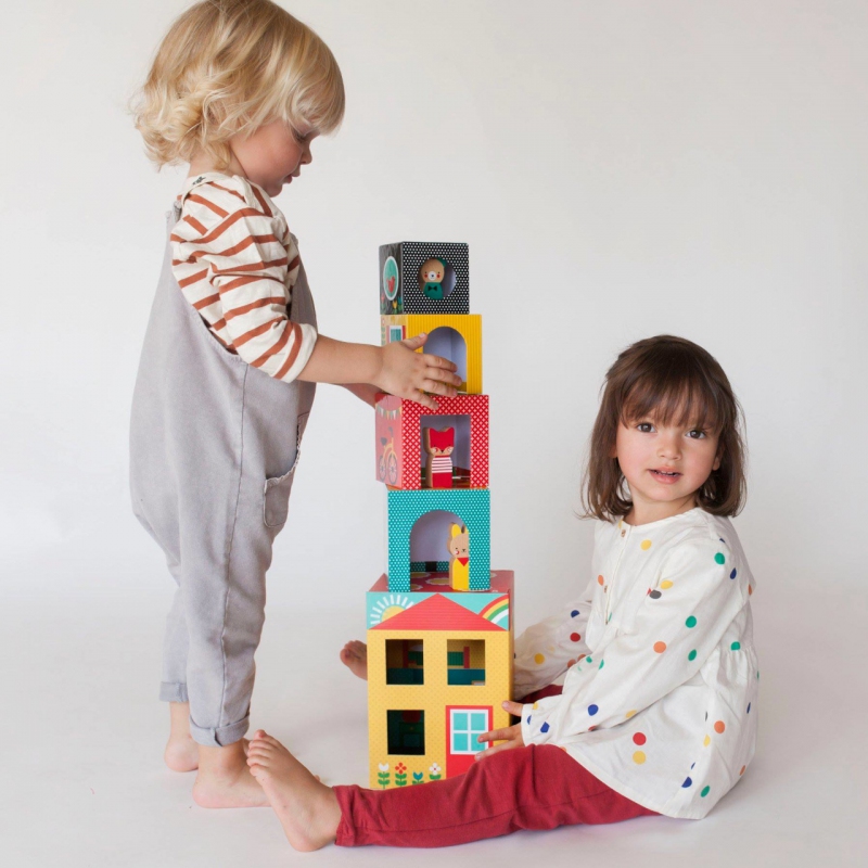 Věž z recyklovaného kartonu s dřevěnými postavičkami.