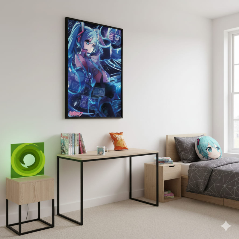 Plakát s grafikou digitální super hvězdy a zpěvačky Hatsune Miku z oblíbeného japonského vocaloidu bude ozdobou vaší domácnosti i pracovny.