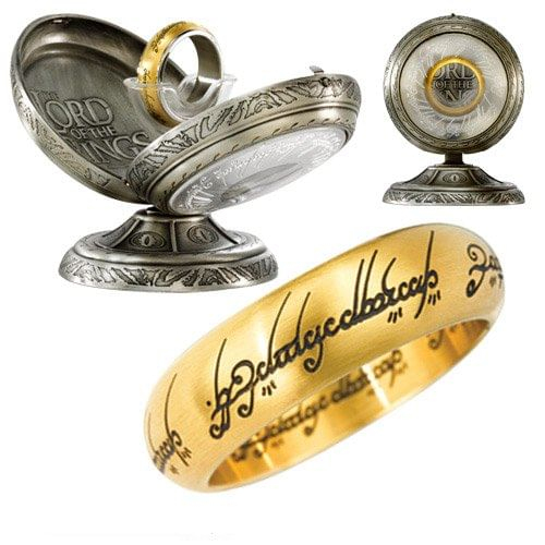 Replika jednoho prstenu z filmů Pán Prstenů a Hobit ve zlatém provedení. Po obvodu prstenu jsou vyryty znaky. Prsten je vyrobený z nerezové oceli a je galvanicky pozlacený. Součástí je dárková krabička s motivy z filmu Pán prstenů. K mání v různých velikostech. Odkazy Jak vybrat správnou velikost + tabulka velikostí