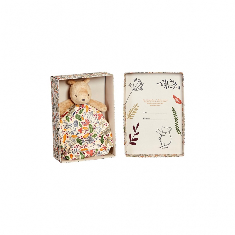 Je čas se přitulit! Tento rozkošný super měkký usínáček s Medvídkem Pú medvídek oživuje rozmarné vyprávění příběhů A. A. Milne ze stokorcového lesa. Je dokonalý společník pro usínání, mazlení nebo jen uklidnění dítka. Hebký usínáček s krásnou moderní vzorovanouz látkou. Usínáček je vyroben z udržitelných materiálů. Výplně jsou vyrobeny z recyklovaných plastových láhví a recyklované plyšové látky. Dodáváno v krásně ilustrované dárkové krabičce, do které je možné vepsat věnování.