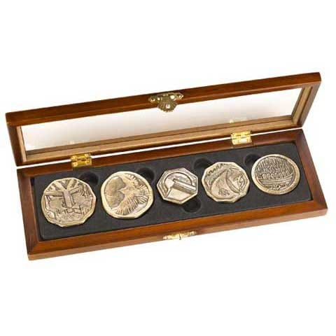 Autentická replika mincí z pokladu trpaslíků - z filmového zpracování Tolkienova Hobita. Sada obsahuje pět mincí v dřevěné výstavní krabičce.