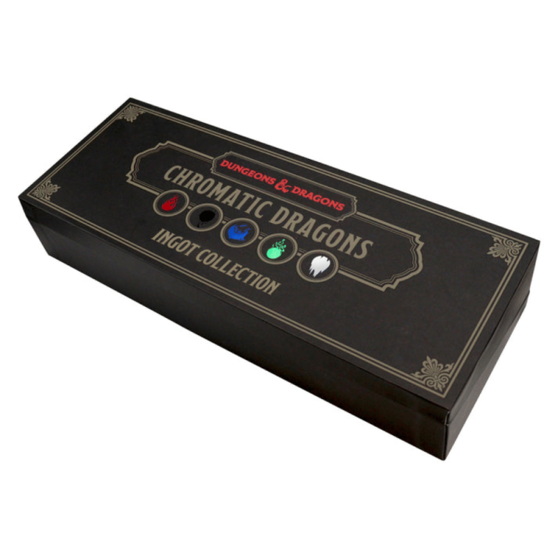 Chromatičtí draci jsou typem draků známých po celém Faerûnu pro své charakteristické jednobarevné šupiny. Nově pět nejběžnějších z nich můžeš získat v sadě barevných ingotů. Sada je limitována na 1 974 kusů po celém světě (na oslavu 50 let Dungeons & Dragons), je individuálně číslovaná a je uložena ve výstavní krabičce. Každý ingot má velikost 90 x 45 mm a je potištěný barevným motivem draka.Tato sada ingotů je dechberoucí dárek pro tvého oblíbeného DM, společníka ve zbrani na mnoha dobrodružstvích ve Forgotten Realms, nebo prostě pro sebe, když si chceš pořídit dárek, který neztrácí sběratelskou hodnotu.