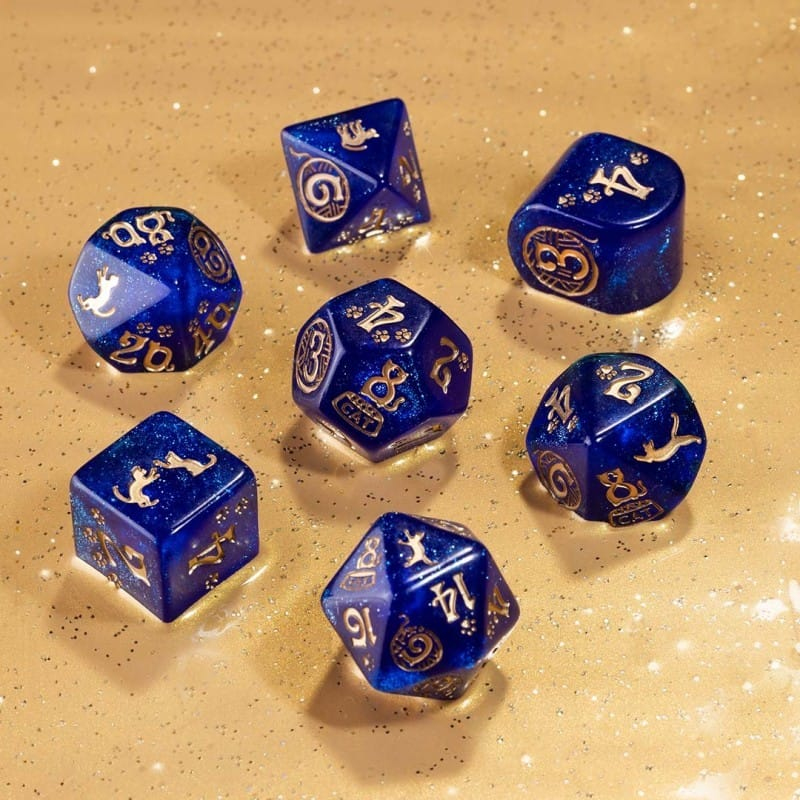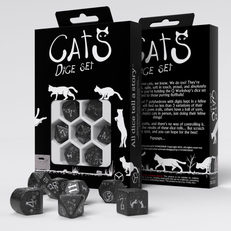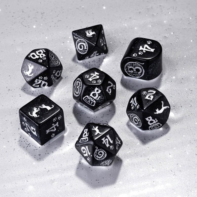 Sada obsahuje 7 mnohostěnných kostek s hravými kočkami. Kostky využijete pro hraní her na hrdiny i deskových her. Každá kostka má originální kočičí grafiku a obsahuje třpytky. Hoďte kostkami, ať se vymňouknou! Balení obsahuje 1x čtyř, 1x šesti, 1x osmi, 1x desíti, 1x dvanácti, 1x dvaceti stěnnou a 1x procentovou kostku. K6 má hranu 15 mm. Ke kočičím kostkám se skvěle hodí pytlík na kostky CATS: The Mooncat (svítící ve tmě).