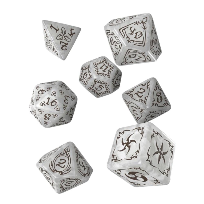 Sada Hlasy z hlubin má kombinaci perleťové a hnědé barvy. Připomíná prastaré artefakty, nalezené v ruinách zapomenutých chrámů. Každý hod tě zaručeně propojí s mocí, která dávno zmizela z povrchu světa. Design navržený Anne Stokes, světoznámou fantasy ilustrátorkou, dává každé kostce jedinečný vzhled s tribal motivy připomínajícími rituální symboly a kmenové znaky. Ideální kostky pro charaktery – Monk, Druid i pro Čaroděje. Uvnitř najdeš kompletní sadu 7 kostek (k4, k6, k8, k10, k%, k12 a k20).
