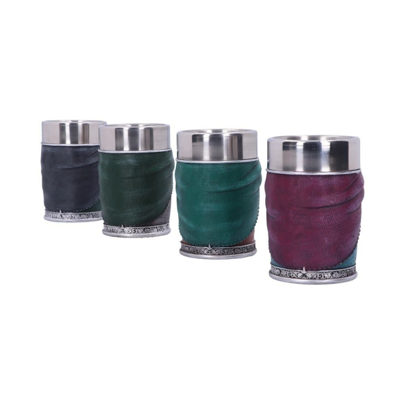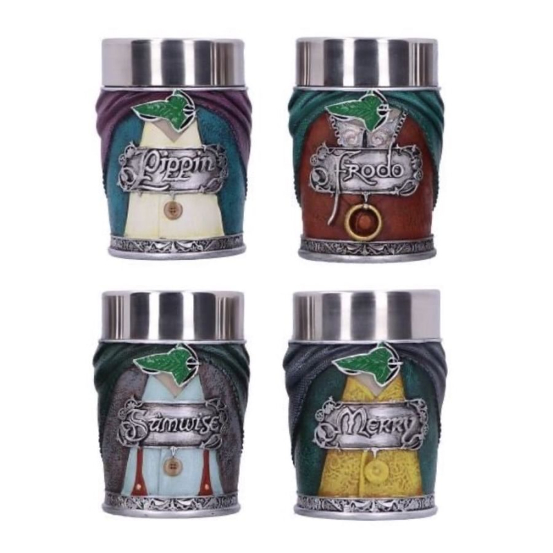 Štamprle, půlka, prcek... V této sadě najdete hned čtyři krásné hobití "prcky", oděné do elfích plášťů a nesoucí jména čtveřice malých členů Společenstva prstenu z fantasy ságy Pán prstenů: Frodo, Sam, Pipin a Smíšek. Na panácích naleznete jedinečné detaily, jako jsou Frodův Prsten moci či spony v podobě elfích lístků. Vše ručně malováno. Panáky mají objem 6 cl, vysoké jsou 8,3 cm, průměr 5,4 cm.