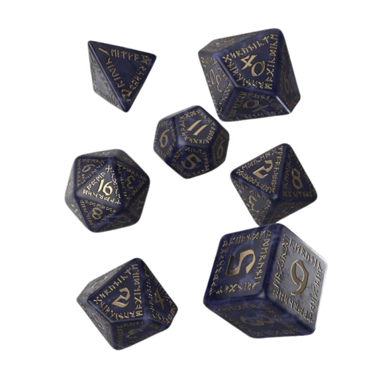 Sada precizně vyvedených kostek s gravírovanými nápisy v trpasličích runách, ideální doplněk pro hráče her na hrdiny. Sada obsahuje sedm kostek: čtyř, šesti, osmi, desíti, dvanácti, dvaceti stěnnou a procentovou kostku. Kostky jsou k dispozici v barvě temně modré se zlatým nápisem.