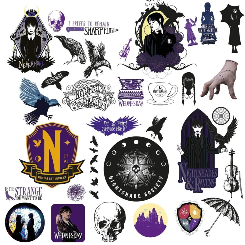 V sadě najdeš na 5 arších 33 vinylových samolepek s motivy ze seriálu Wednesday od Netflixu. Vyzdob si svůj laptop, tablet nebo smartphone v tom správném temném gotickém stylu!