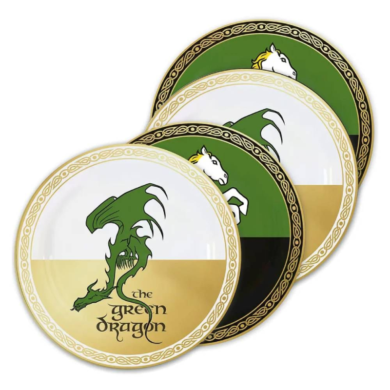 Zastav se na něco dobrého U Skákavého poníka nebo U Zeleného draka! Tato jedinečná sada 4 keramických talířů je inspirovaná legendárními hospodami U Skákavého poníka v Hůrce a U Zeleného draka v Hobitíně – oblíbenými místy všech poutníků, hobitů i bardů. Jejich průměr je 21 cm a jsou vyrobeny z kvalitní glazované keramiky. Ať už servíruješ snídani, oběd nebo večerní občerstvení k filmům Pán prstenů, s těmito talíři bude každé jídlo zážitkem. Talíře jsou vhodné do myčky a mikrovlnky.