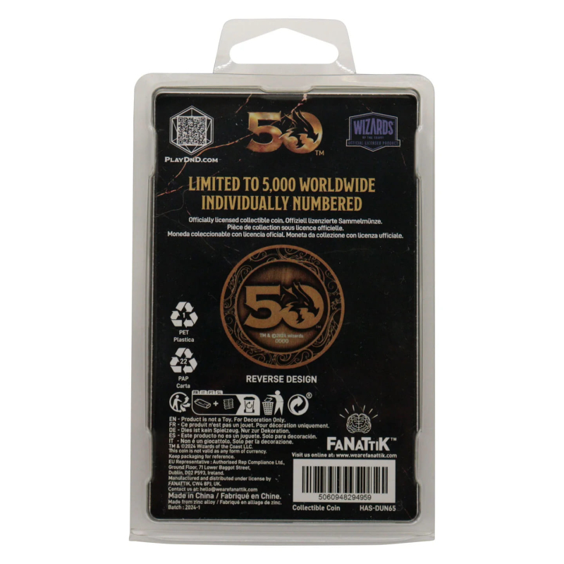Tato limitovaná edice sběratelské mince o průměru 38 mm k oslavě 50. výročí Dungeons & Dragons, nejvýznamnějšího RPG, jaké kdy existovalo, je vyražena s designem původní příručky základních pravidel. Mince se starožitným vzhledem má číslování, protože existuje jen jako jedna z 5000 po celém světě.