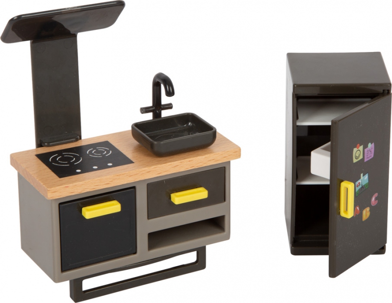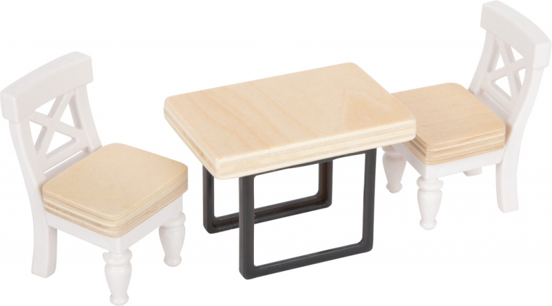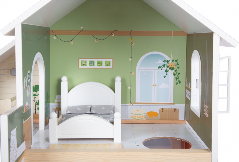 Najdete zde také 8 ks nábytku, textilní doplňky jako např. povlečení a polštáře. Velká terasa s posezením, otevíratelná toaleta, kuchyňské skříňky a lednice s dveřmi, také šuplíky zajistí realistickou hru. Lavice i postel mají textilní polštáře, postel také peřinu.