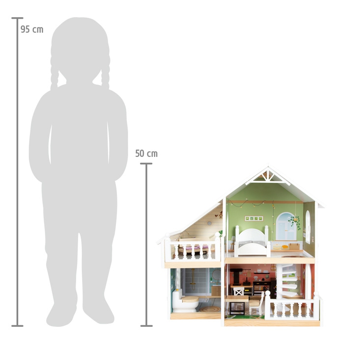 Perfektní hračka pro představivou hru dětí. Otevřené bydlení s točitým schodištěm, otevíratelnými okny, moderní koupelnou v přízemí, s plexisklem.