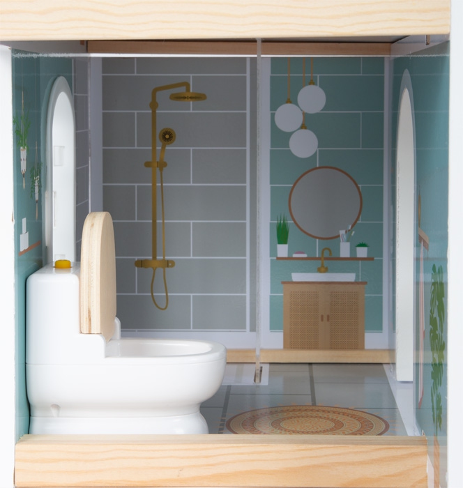 Tento moderní domeček pro panenky má otevřenou přední stranu s krásnými uměleckými detaily a moderním interiérem. Kombinovaná kuchyně s jídelním koutem, ložnicí, koupelnou a také malou terasou s posezením.