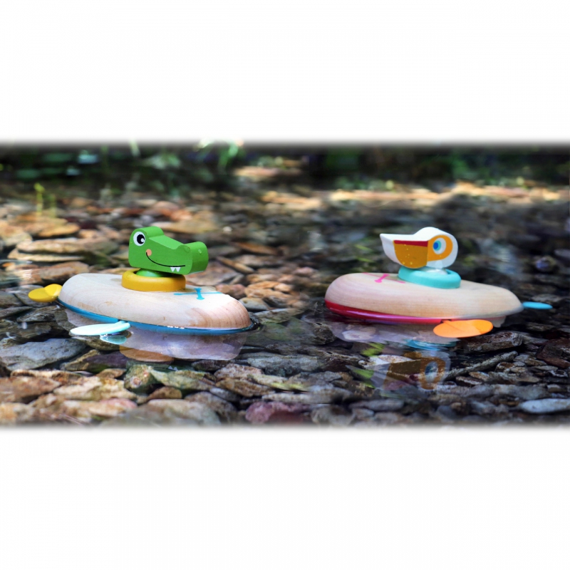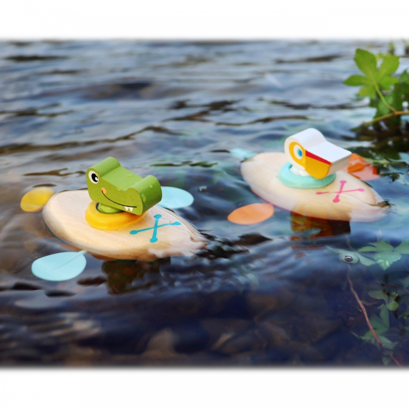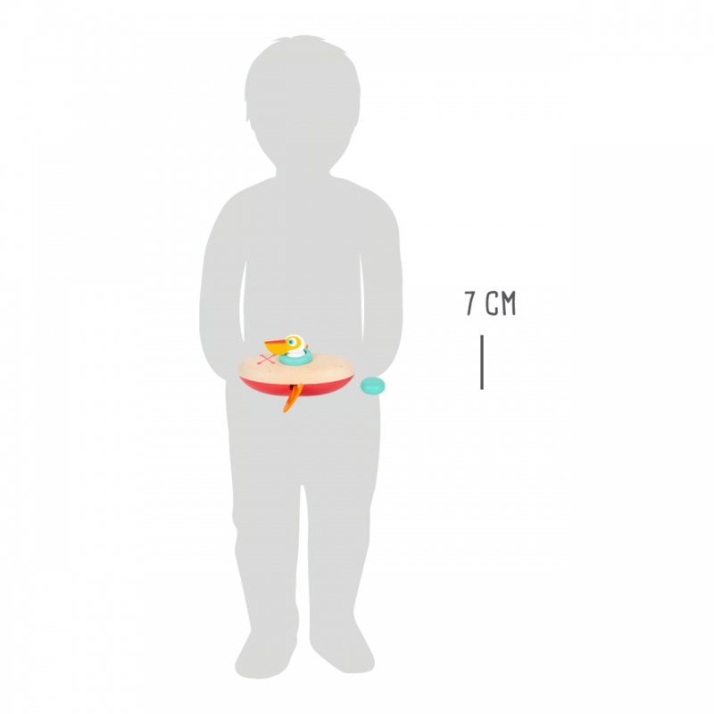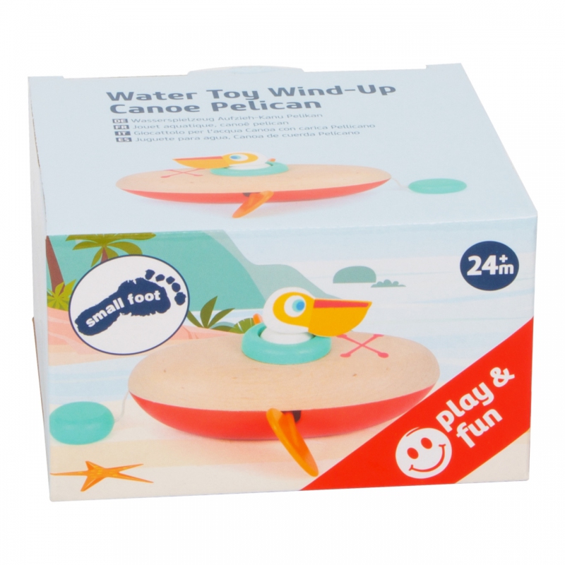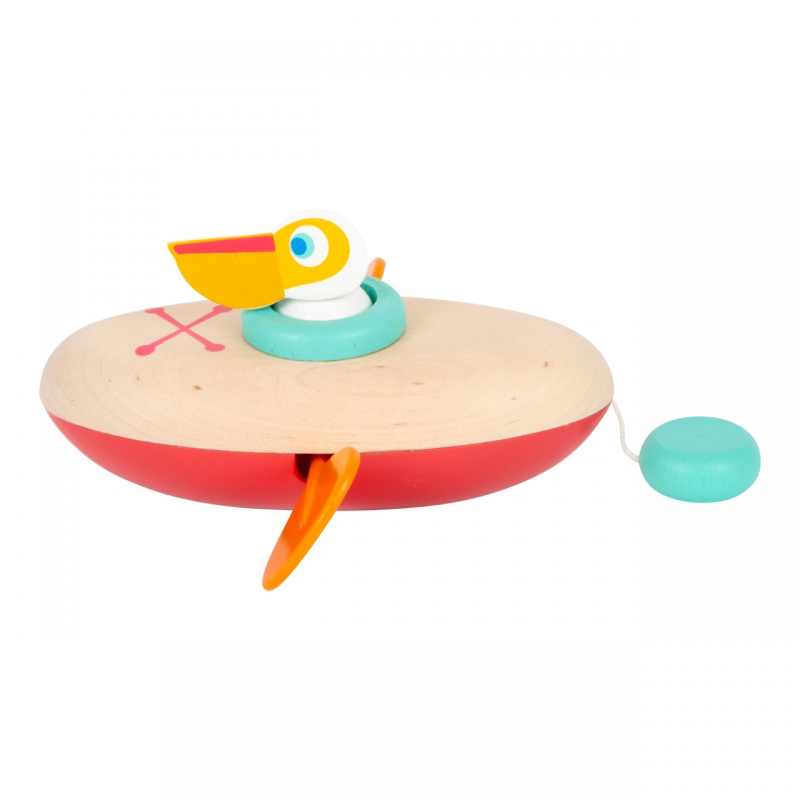 Malý pelikán dostal zelenou a může vyjet na plavbu. Jeho kánoe je vyrobená ze dřeva a plastu, po vodě dokáže plavat úplně sám – má natahovací mechanismus. S touto hračkou si děti užijí ve vodě mnoho zábavy. Pro delší životnost hračky ji po vytažení z vody pořádně osušte. Vodní hračky vyrobené ze dřeva jsou ekologičtější alternativou plastových a gumových hraček. Při hře s pelikánem se děti naučí o principu příčiny a následku, díky natahovacího mechanismu.