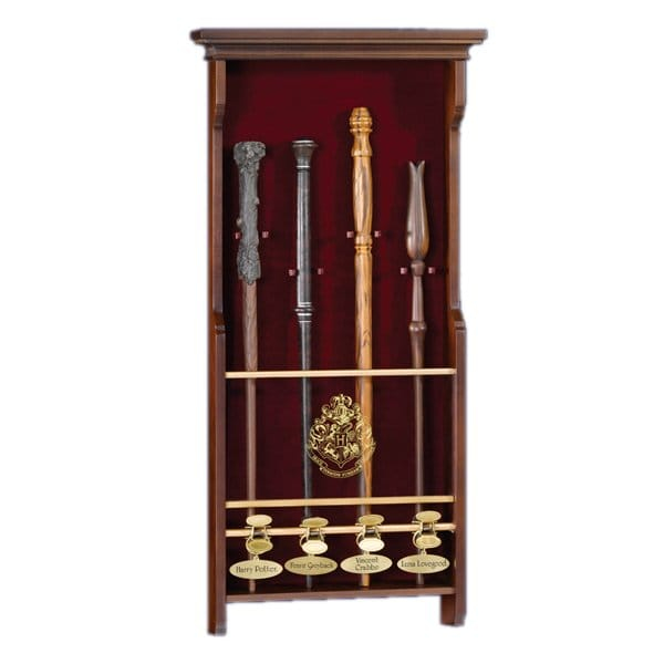 Stojan z lakovaného dřeva na čtyři kouzelnické hůlky - repliky z filmového zpracování Harryho Pottera. Zadní strana je pokryta červeným sametem a je opatřena nenápadnými úchyty na hůlky. V dolní části je kovový prut pro umístění cedulek, které jsou součástí hůlek. Rozměry vitríny jsou 22,5 x 47,5 x 7 cm, v zadní části je opatřena dvěma kovovými poutky k zavěšení na zeď. Obrázek je pouze ilustrační, hůlky nejsou součástí stojanu.