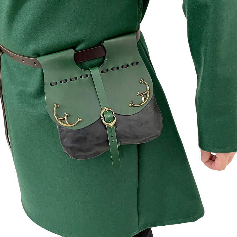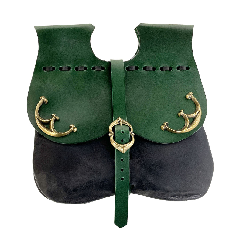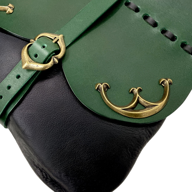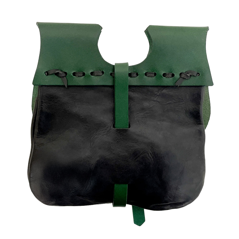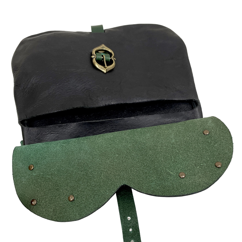 Ručně vyráběná kožená brašna z naší dílny vychází z historických „ledvinek“, které byly oblíbené v 15. století. Praktická, pohodlná a zároveň věrná dobovým předlohám! Brašna má zaoblenou klopu v zelené barvě, doplněnou o dva kovové zdobné prvky. Zbytek je elegantně černý, takže celek působí kontrastně a velmi stylově. Klopa zároveň slouží jako poutko pro snadné navlečení na opasek – prostě jen navlékneš a jdeš. S rozměrem 21 x 20 cm nabízí dost místa na to, co potřebuješ mít po ruce. Ať už se chystáš na LARP, fantasy nebo historickou akci – tahle brašna ti bude věrným společníkem.