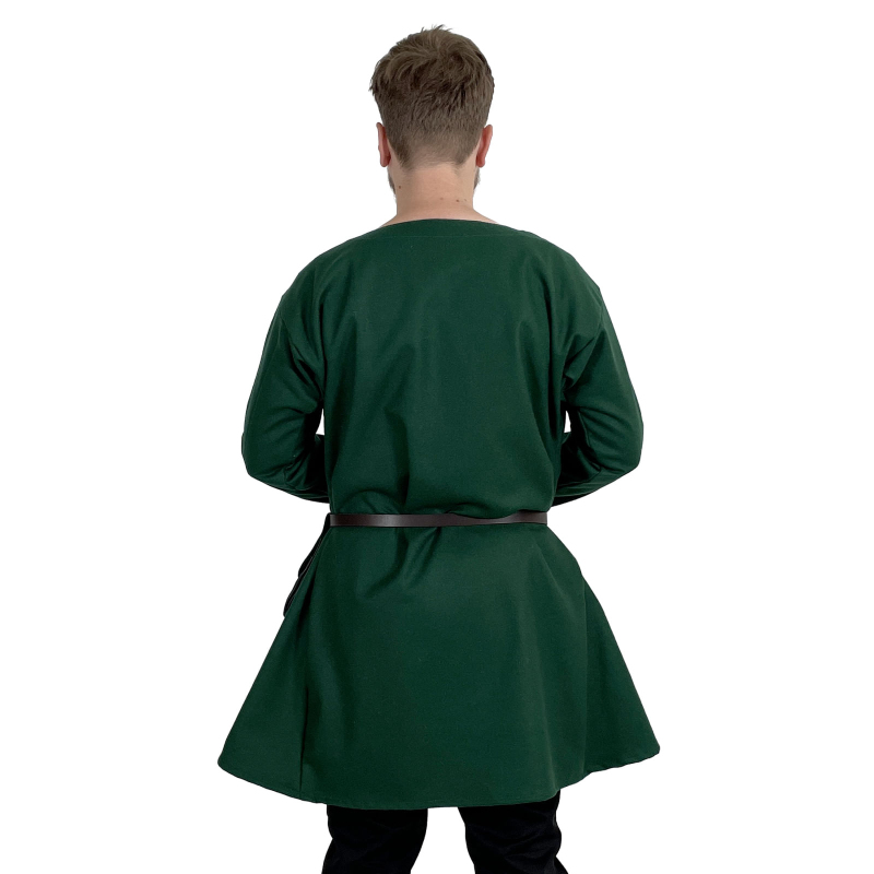 Tuniku, která tě nenechá napospas chladu ani pohledům ostatních! Ušitá podle střihů z 12.–15. století, z kvalitní vlny, která hřeje, dýchá a drží tvar i po celém dni ve zbroji, u ohně nebo v dešti. Zelená barva snadno zapadne mezi přírodní tóny – ladí s hnědým pláštěm, koženým opaskem i jednoduchými nohavicemi. Volný střih zajistí pohodlí, ať už běžíš do bitvy nebo jen sedíš s číší medoviny v krčmě. A pokud se ochladí, stačí přidat naší dlouhou bavlněnou spodní tuniku a vrstvit.