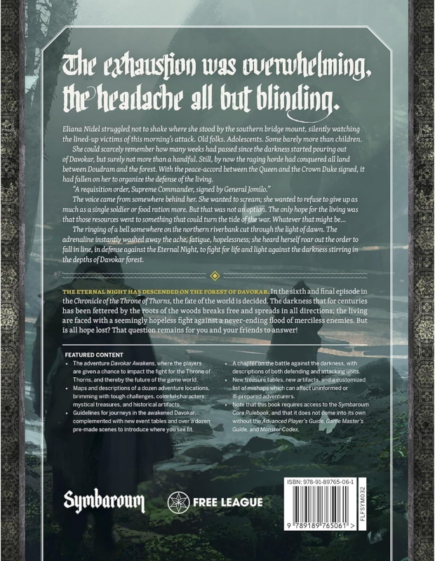 Příručka Davokar Awakens s dobrodružstvím pro švédskou fantasy hru na hrdiny Symbaroum RPG Příručka je v angličtině. A Symbaroum adventure The Eternal Night has descended on the Forest of Davokar. With the sixth and final episode in The Chronicle of the Throne of Thorns, the fate of the world will be decided. The darkness that for centuries has been fettered by the roots of the woods breaks free and spreads in all directions; the living are faced with a seemingly hopeless fight against a never-ending flood of merciless enemies. But is all hope lost? That question remains for you and your friends to answer. Featured Content Kniha obsahuje: The adventure Davokar Awakens, where the player characters are given a chance to impact the fight for the Throne of Thorns, and thereby the future of the game world. Maps and descriptions of a dozen adventure locations, brimming with tough challenges, colorful characters, mystical treasures, and historical artifacts. Guidelines for journeys in the awakened Davokar, complemented with new event tables and over a dozen pre-made scenes to introduce where you see fit. A chapter detailing the battle against the darkness, with descriptions of both defending and attacking units. New treasure tables, new artifacts, and a customized list of mishaps which can affect uninformed or ill-prepared adventurers. Note that this book requires access to the Symbaroum Core Rulebook, and that it does not come into its own without the Advanced Player’s Guide, Game Master’s Guide, and Monster Codex.