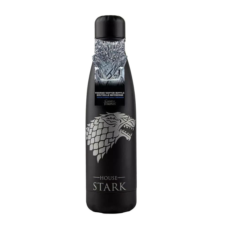 Nerezová láhev na vodu pro fanoušky rodu Starků z Game of Thrones - Hry o trůny vám dopřeje to správné osvěžení! Láhev udrží váš nápoj studený či teplý až 15 hodin. Láhev není vhodná do mikrovlnky ani do myčky nádobí.