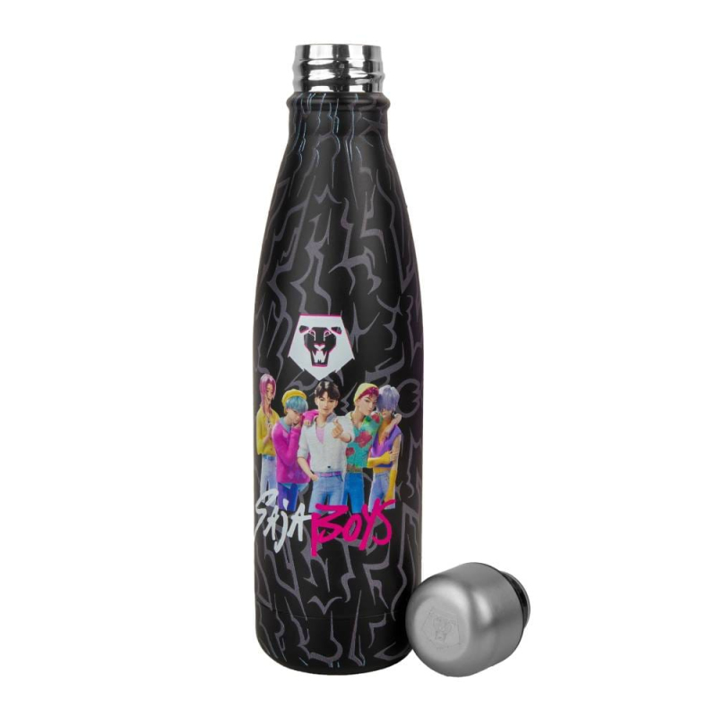 Ukaž svůj styl a sílu s Termoláhví Kpop Demon Hunters - Saja Boys, inspirovanou klučičí démoní skupinou Saja Boys z filmu KPop Demon Hunters! Výrazný design a elegantní nerezové provedení zachycuje členy Jinu, Mystery, Romance, Abby a Baby. Láhev udrží tvé nápoje horké i studené po dlouhé hodiny, takže je ideální pro každodenní pitný režim ve škole, v práci, při tréninku i na cestách. Vyrobena je ze 100% nerezové oceli, má šroubovací stříbrné víčko s logem Saja Boys a její objem je 500 ml.