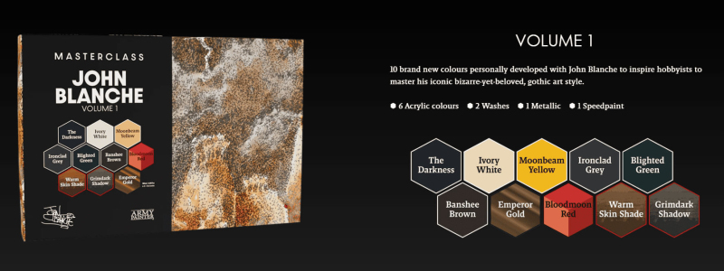 Přál sis někdy malovat miniatury strašidelným a drsným stylem světa Warhammer? John Blanche ti s tím rád pomůže! Válečný vizionář a legendární umělec John Blanche spojil své síly s odborníkem na barvy The Army Painter, aby ti představili sadu barev Masterclass. Volume I, první vydání této velmi očekávané kooperace, obsahuje 10 barev osobně vyvinutých Johnem Blanchem, aby inspirovaly hobbysty ke zdolání jeho ikonického ponurého, gotického stylu známého též jako grimdark. Díky mimořádné kvalitě barev Warpaints Fanatic a Speedpaints obsažených v této sadě si také ty můžeš osvojit jeho nádherně ponuré, často bizarní, ale oblíbené techniky, které posunou tvé malování na další úroveň. Tato sada ve sběratelské kvalitě navíc představuje exkluzivní kresby Johna Blanche, takže ji musí mít každý nadšenec. Uvnitř série Masterclass John Blanche Volume I najdeš 10 bohatých barev, včetně 1 unikátní Speedpaint, 6 lahviček Warpaints Fanatic (2 inspirované paletou Zorn a 4 rozšiřující Flexible Triad System). Sadu doplňují 2 washe a 1 metalická barva, které nabízejí vše, co potřebuješ k oživení vize Johna Blanche. Obsah balení: 6 Acrylic colours 2 Washes 1 Metallic 1 Speedpaint