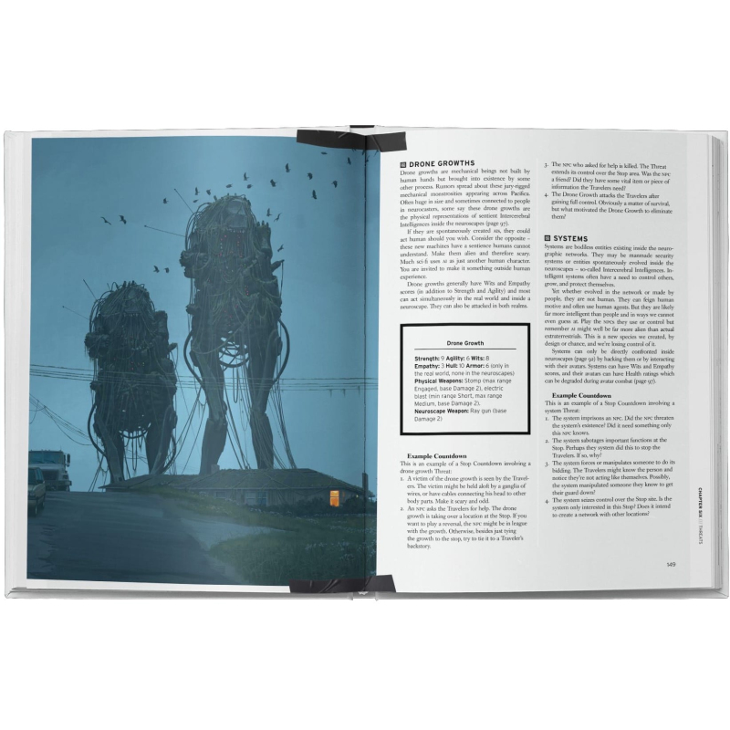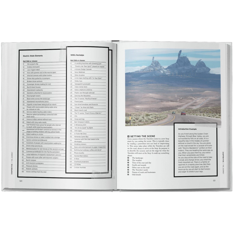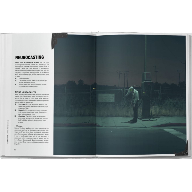 When did it all start? I can’t really remember. It started like any recreational activity, I guess. Like TV. Sometimes they watched TV and sometimes they would sit there wearing their neurocasters. I didn’t care. It was after the big update of 1996 that things got weird. Mode Six. Vydej se na cestu podivnou Amerikou v alternativním roce 1997. Západní pobřeží je poseté vraky gigantických bitevních dronů nahromaděné spolu s odpadky high-tech konzumní společnosti v úpadku. Příručka je v angličtině. Hra na hrdiny The Electric State není primárně o cíli nějakého dobrodružství, ale o samotném průběhu – o tom, co postavy ve skupině cestovatelů na své cestě prožívají a jak je to mění. Klade se důraz na průzkum a ať už jde o opuštěný venkov nebo velkoměsta, v této bizarní alternativní historii je rozhodně co objevovat. Kniha také obsahuje samostatnou mapu oblasti nazvané Pacifica. Ta zahrnuje prostředí mezi San Franciscem a Los Angeles na hranici s výlučnou zónou Blackweltu. Herní styl The Electric State RPG Core Rulebook je zaměřený na zjišťování toho, kdo jsi v tomto novém uspořádání světa a kdo jsou tví přátelé. Během dobrodružství si budeš nejednou klást otázku: Co jsi ochotný udělat, když se kolem tebe hroutí svět? Toto stolní RPG používá osvědčený herní systém Year Zero Engine, známý z jiných oceňovaných her na hrdiny od Free League jako je Mutant: Year Zero, Tales From the Loop, ALIEN a Blade Runner. V principu jde o hod několika šestistěnnými kostkami, kde pro úspěch akce stačí, když padne alespoň jedna šestka. Počet použitých kostek závisí na hodnotě tvého hlavního atributu, jimiž je Síla, Obratnost, Důvtip, Empatie, Zdraví a Vybavení. Příručka je vizuálně založena na narativní umělecké knize The Electric State. Jedná se o plnobarevný svazek v pevné vazbě s desítkami ilustrací od uznávaného vizuálního umělce Simona Stålenhaga.