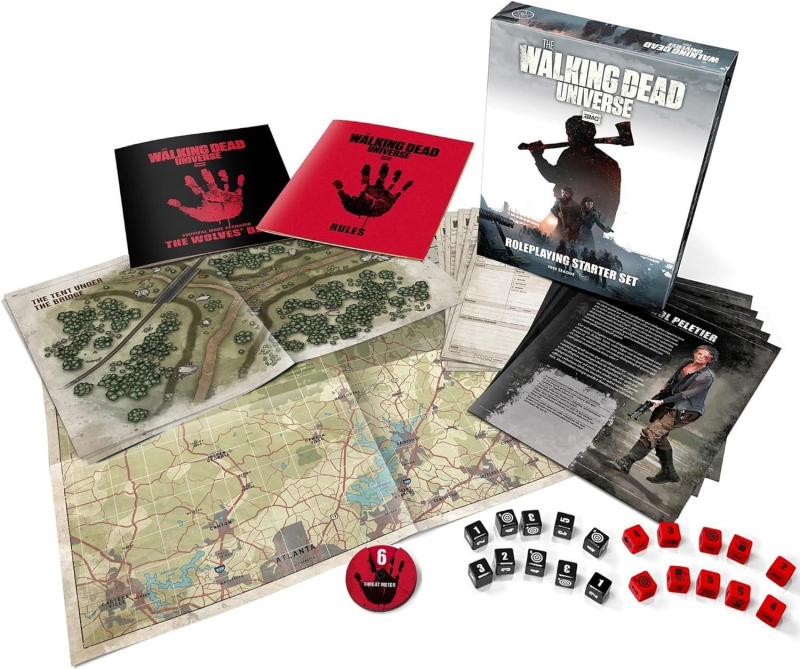 Krabice se startovní sadou pro hru na hrdiny The Walking Dead Universe RPG obsahuje příručku se zkrácenými pravidly, předem vygenerované postavy, herní scénář pro vaše hraní a další příslušenství. Sada je v angličtině. The boxed Starter Set for The Walking Dead Universe RPG includes a condensed rulebook, pre-generated characters and the first full-length survival scenario for you to play. Obsah krabice: STARTER SET CONTAINS a 40-page condensed rulebook. The game rules are based on the acclaimed Year Zero Engine, but further developed and uniquely tailored for The Walking Dead Universe Roleplaying Game. SURVIVAL MODE: The 16-page booklet The Wolves’ Den – presenting the first full‑length survival mode scenario for the game. CHARACTERS: Six pre-generated characters to play, plus Carol, Gabriel, Glenn and Michonne from the TV series as playable pre-generated characters. CUSTOM DICE: Ten custom Base Dice and as many Stress Dice, specifically designed for the game, and a Threat Meter, to keep track of the threat from walkers in the surroundings.