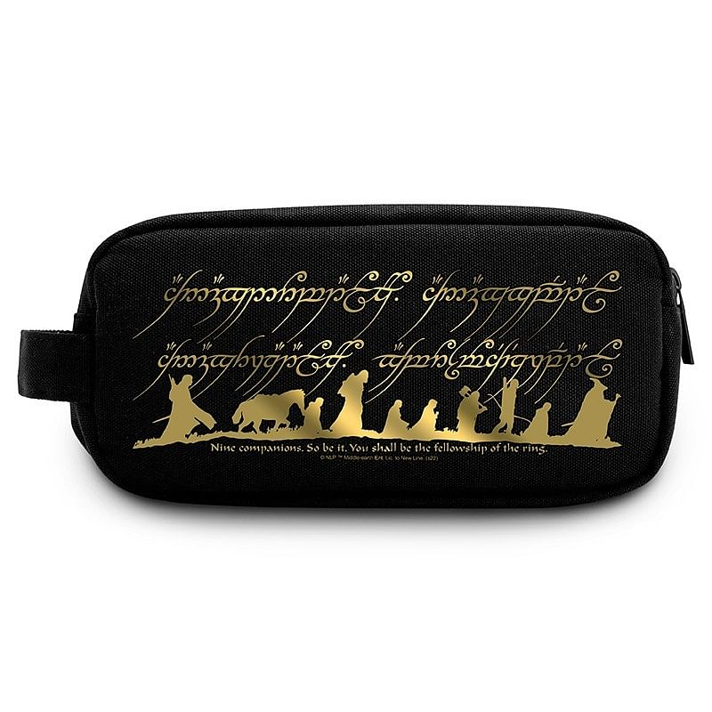 Toaletní či kosmetická taška nebo pouzdro pro fanoušky fantasy ságy Pán prstenů se zlatým vyobrazením Společenstva má zavírání na zip a bude vám užitečným služebníkem na cestách.