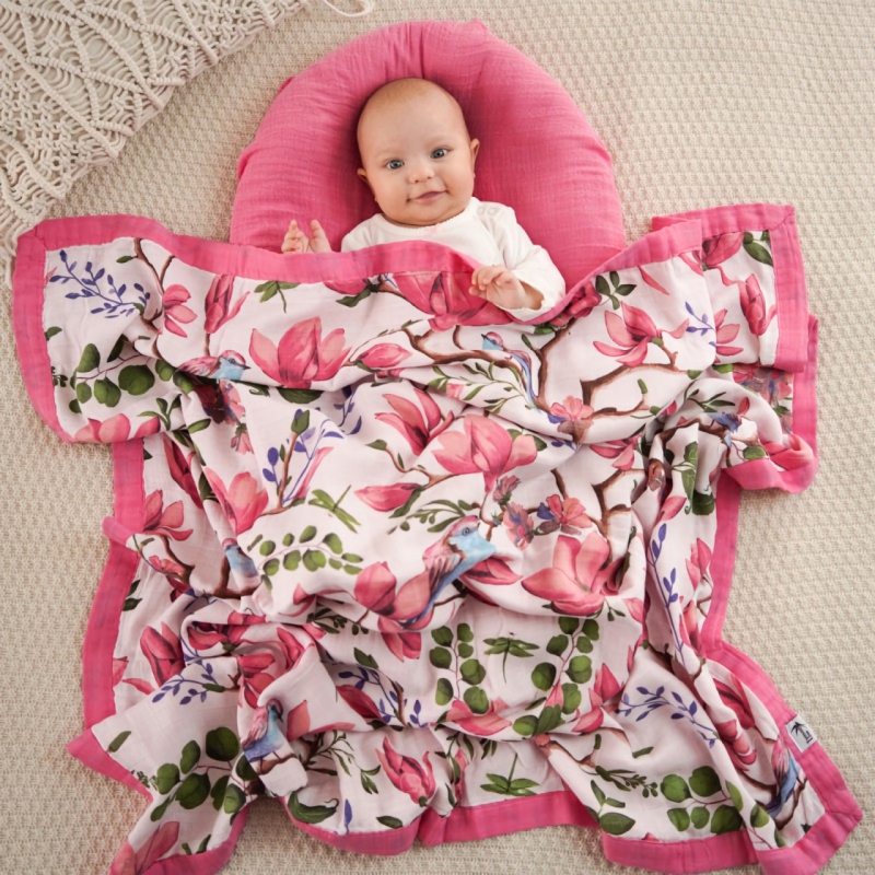 Na světě není nic, co by se podobalo poslouchání zpěvu ptactva z krásného pohodlí v magnóliích. Vyrobeno ze 70% bambusu a 30% bavlny, tyto mušelínové dečky jsou jemné na dotek díky bambusu a zároveň chladí a jsou prodyšné díky bavlně. Čtyři prodyšné vrstvy a svěží design slibují komfort a dny plné radosti a smíchu. Jedinečnost našich deček spočívá v jejich originálním provedení a ve výrobě s láskou.