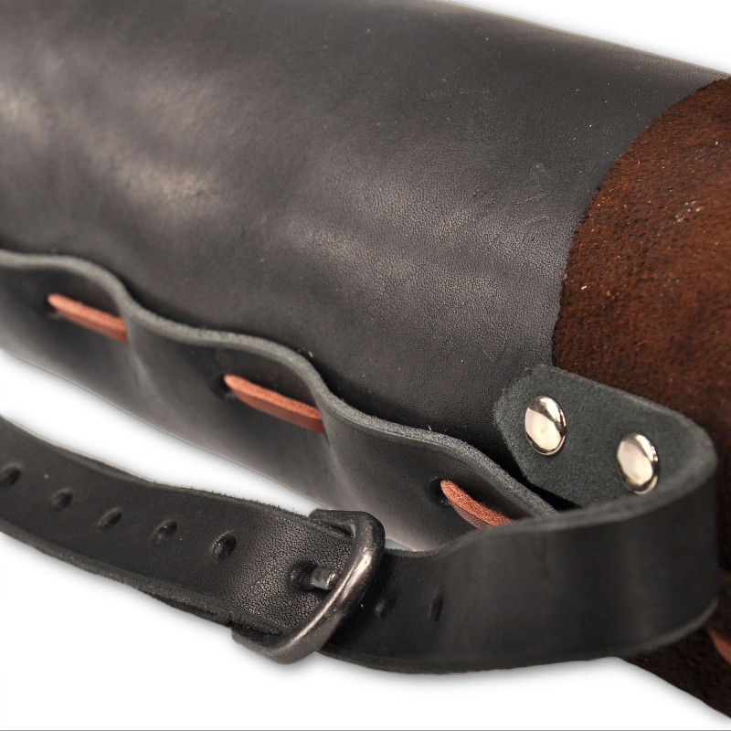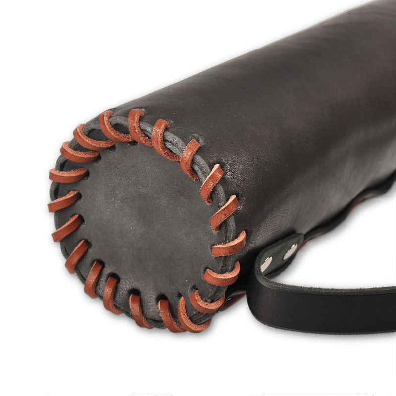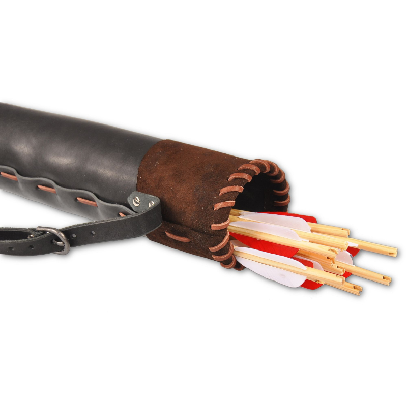 Zádový toulec sešitý koženými řemínky, opatřený popruhem pro nošení přes rameno. Toulec je zhotoven z cca 4 mm silné hovězí kůže, horní lem je opatřen provlékaným zdobením. Délka toulce je cca 60 cm, průměr přibližně 10 cm. Pojme i 40 šípů s hrotem.