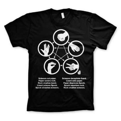 Černé pánské tričko s motivem z oblíbeného seriálu Teorie velkého třesku: Sheldonova oblíbená vyřazovací hra Rock-Paper-Scissors-Lizard-Spock.