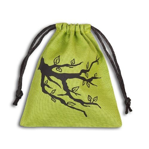 Plátěný stahovací váček na kostky zdobený stromovým motivem. Rozměry váčku jsou 10 x 13 cm.