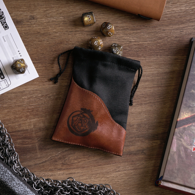 Pevný plátěný váček na kostky pečlivě vyrobený v naší dílně. Při velikosti 9 x 13 cm do něj vměstnáte několik sad kostek, případně figurky, žetony a další drobnosti, které se hodí při hraní her na hrdiny. Váček je ozdoben proužkem hovězí kůže s vypáleným logem hry Jeskyně a draci. Zaručeně udělá radost každému hráči RPG – ať už máte rádi Jeskyně a Draky, Dungeons & Dragons, Dračí doupě nebo Dračí hlídku. Nejste dětmi chaosu a křivé linie vám přijdou rušivé? Máme pro vás rovný váček řádu.