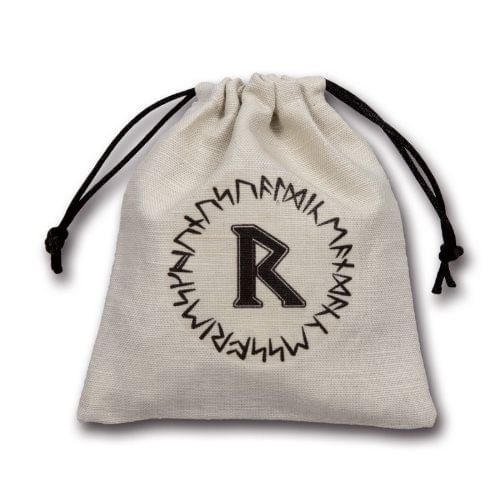 Plátěný stahovací váček na kostky zdobený z obou stran trpasličími runami představujícími kouzlo určené k ochraně uložených cenností, třebas vašich šťastných kostek... Rozměry váčku jsou 10 x 13 cm.