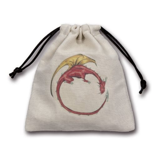 Plátěný váček na kostky zdobený barevným obrázkem draka. Rozměry váčku jsou 10 x 13 cm.