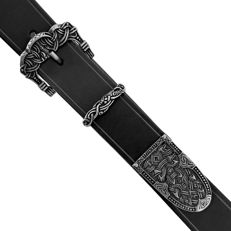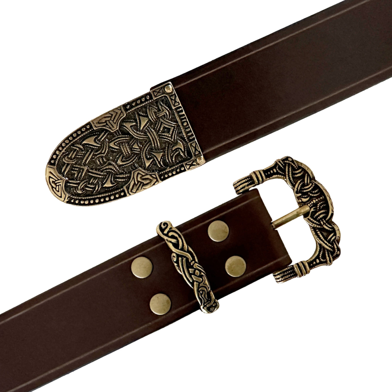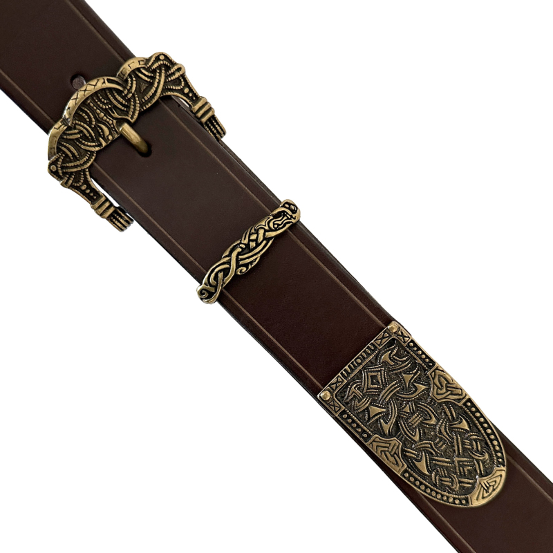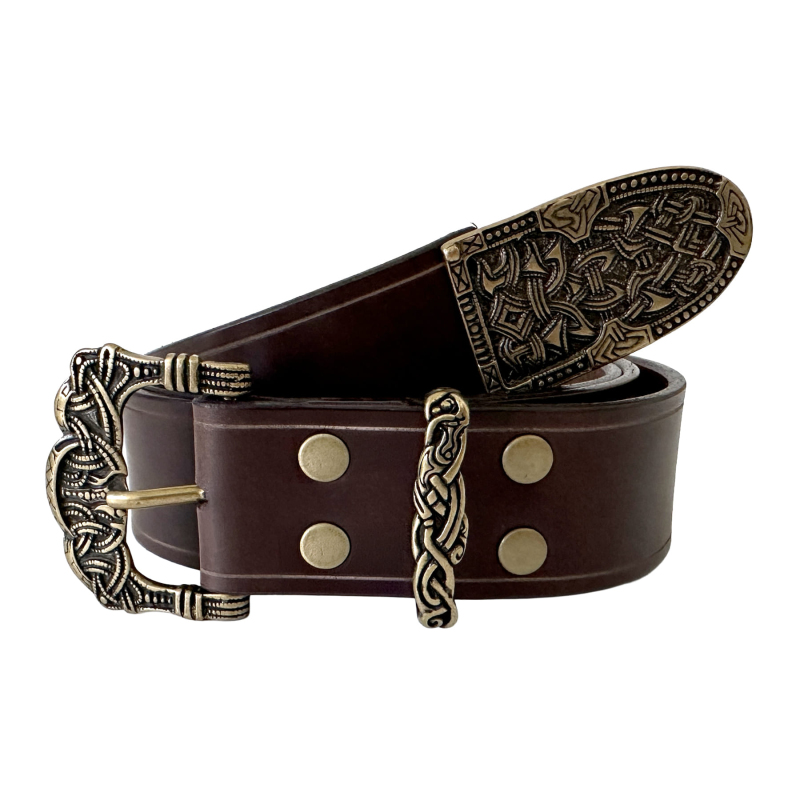 Vlastni kožený opasek inspirovaný slavným nálezem z vikingské pohřební lodi v norském Gokstadu! Spona i nákončí vycházejí z dochovaných archeologických předloh, díky čemuž je opasek ideální volbou pro reenactment, LARP i historické kostýmy na tématické akce. Opasek je vyroben z kvalitní pevné kůže, která něco vydrží a postupem času získá ještě lepší charakter! Skvěle poslouží nejen jako stylový prvek, ale i jako praktický základ pro zavěšení taštice, váčku či zbraně. Na výběr máš dvě varianty: Hnědá se zlatě zbarvenými kovanými detaily a Černá se stříbřitě zbarvenými kovanými detaily. Rozměry opasku jsou 128 x 4 cm.