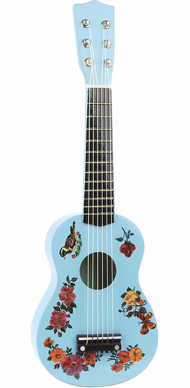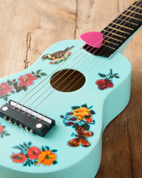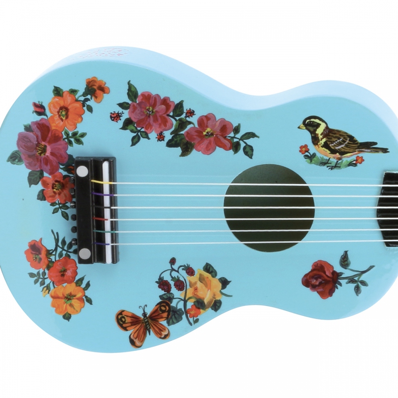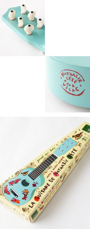 Kytara má natežené nylonové struny. V balení s trsátkem a jednou náhradní strunou. Tuto hračku nelze pokládat za hudební nástroj. Ilustrováno Nathalií Lété.