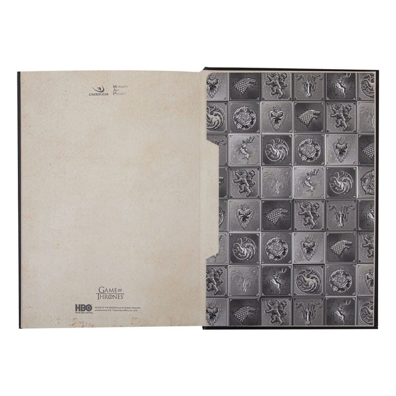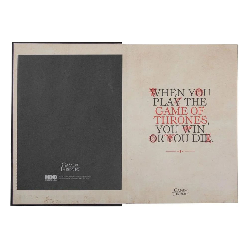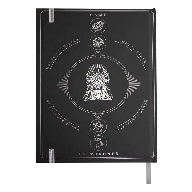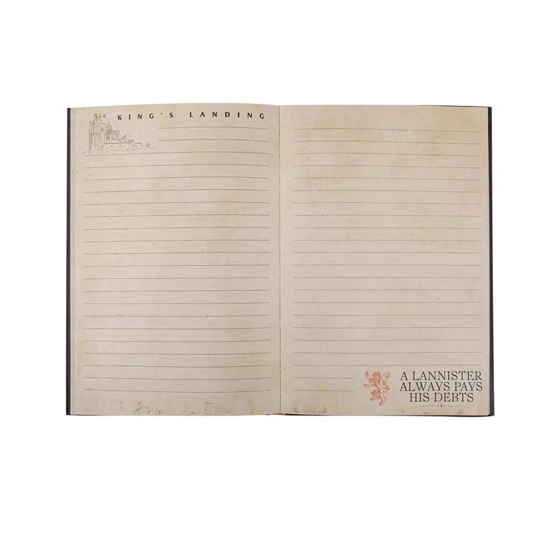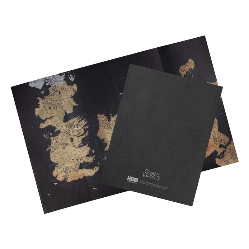 Linkovaný zápisník v pevných deskách potěší fanoušky fantasy série Game of Thrones - Hra o trůny a jako bonus obsahuje mapu Westerosu (Západozemí). Součástí zápisníku je záložka, uzavírá se pomocí gumičky. Rozměry rozložené mapy jsou 51 x 33 cm.
