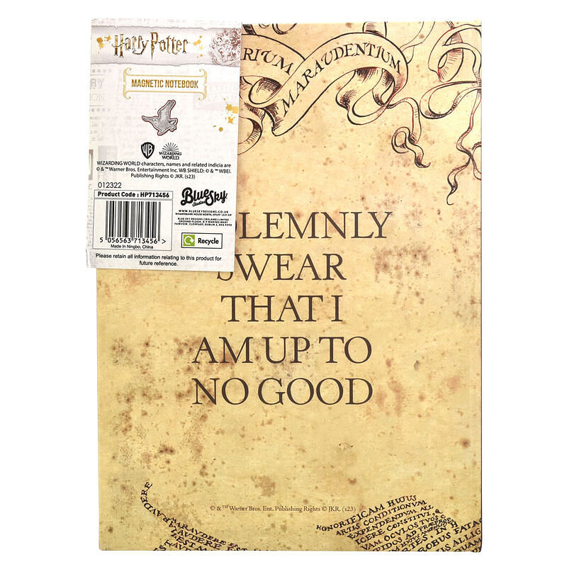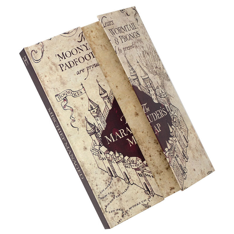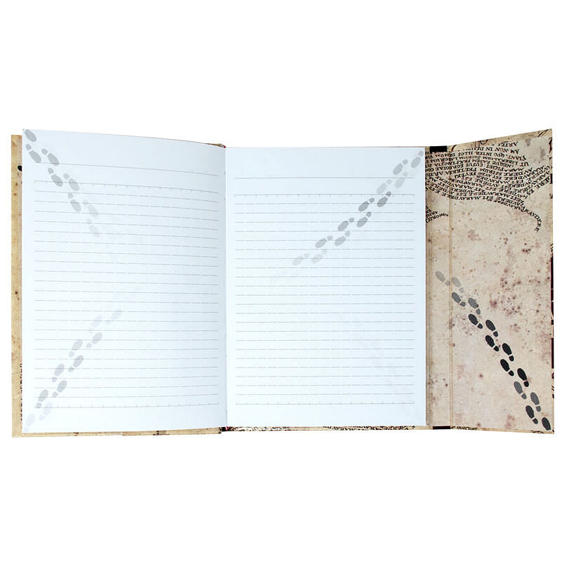 Hezký zápisník v podobě Pobertova plánku z Harry Pottera má magnetické zavírání. Zápisník má linkované stránky, které pokrývají mizející stopy.