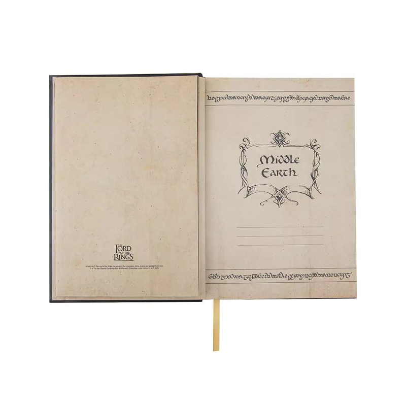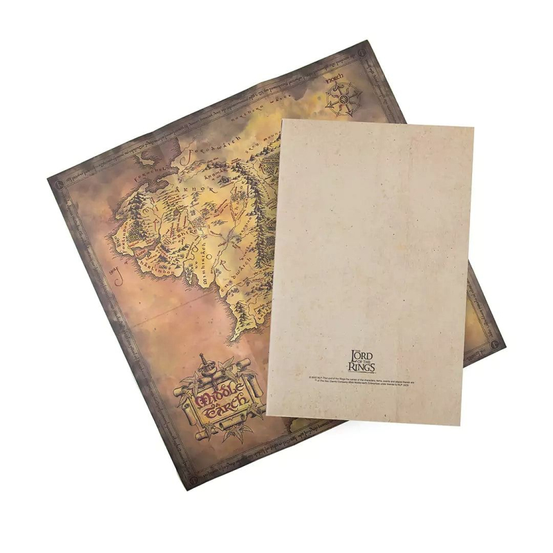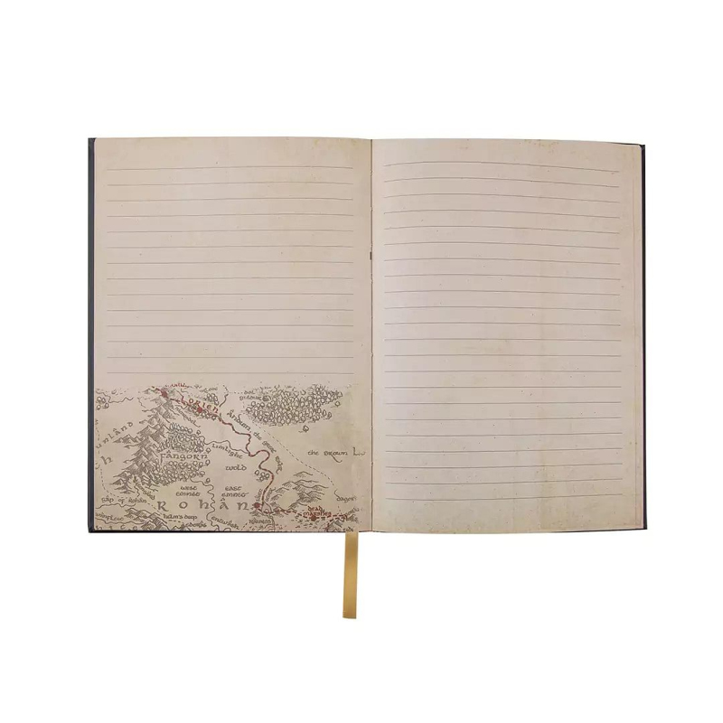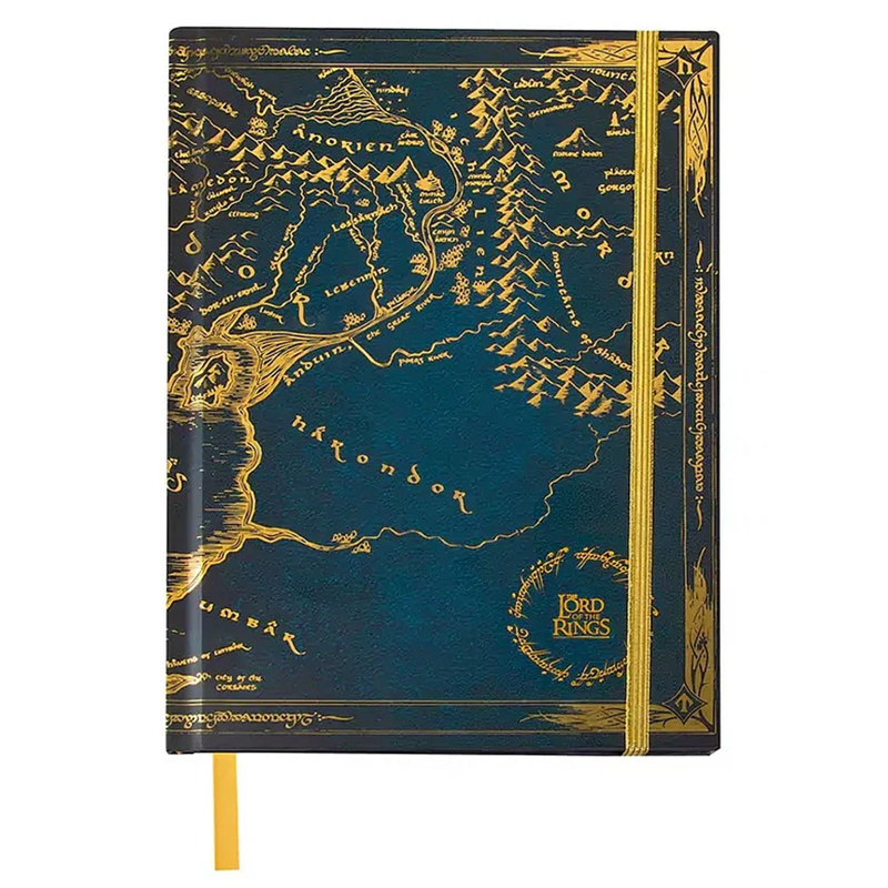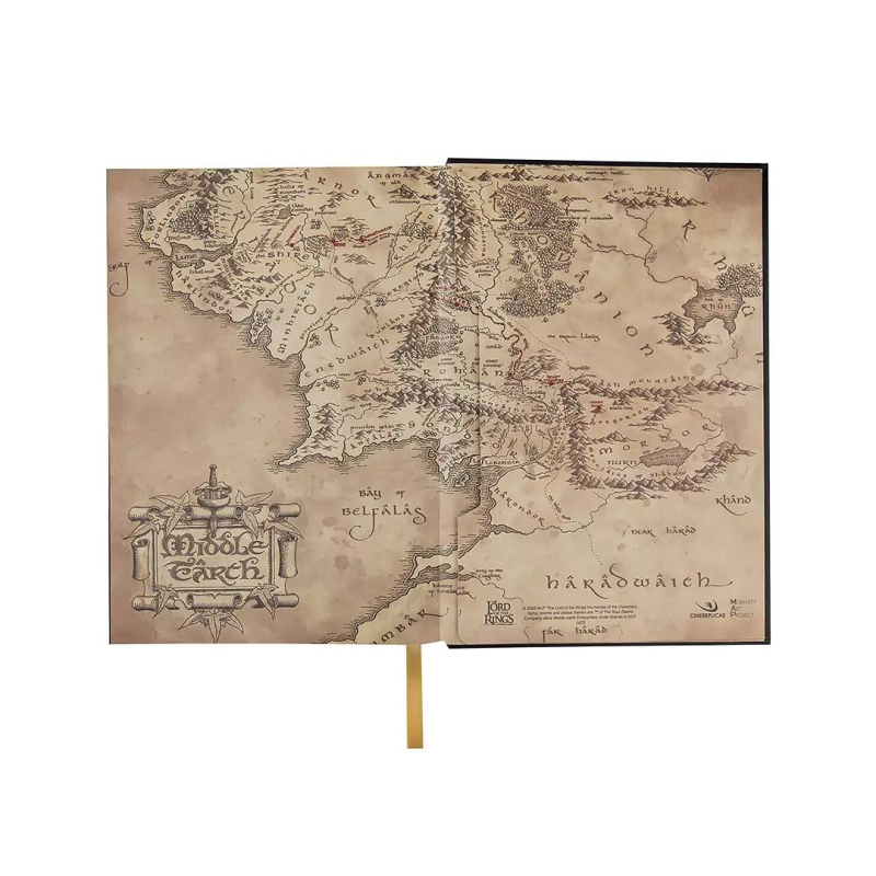 Krásný linkovaný zápisník v pevných deskách pro všechny fanoušky fantasy trilogie Pán prstenů s bonusem v podobě mapy Středozemě. Součástí zápisníku je záložka, uzavírá se pomocí gumičky. Rozměry rozložené mapy jsou 40 x 40 cm.