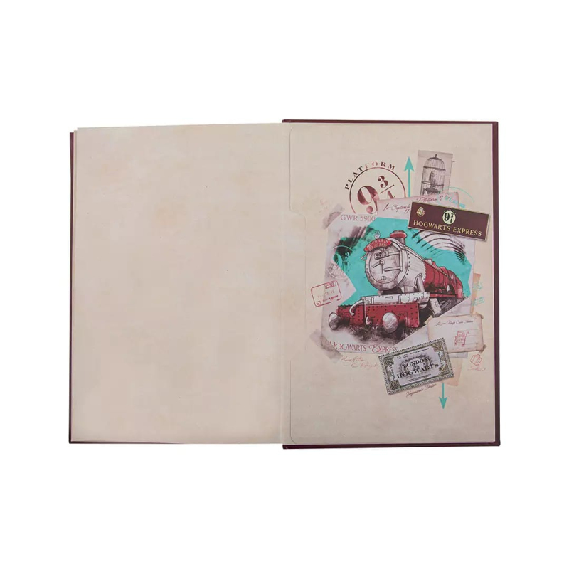 Zápisník s logem Nástupiště 9 a 3/4 a záložka v podobě jízdenky na Bradavický expres potěší fanoušky Harryho Pottera. Zápisník je linkovaný, v pevných deskách a zavírá se pomocí stužky.